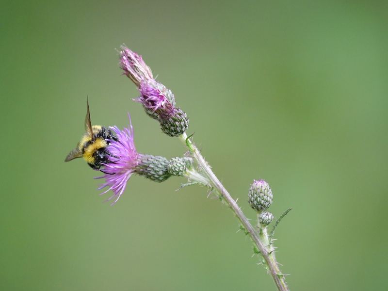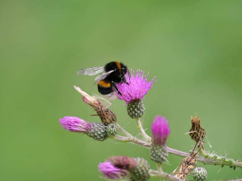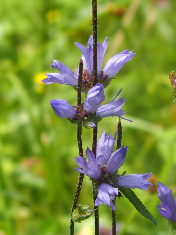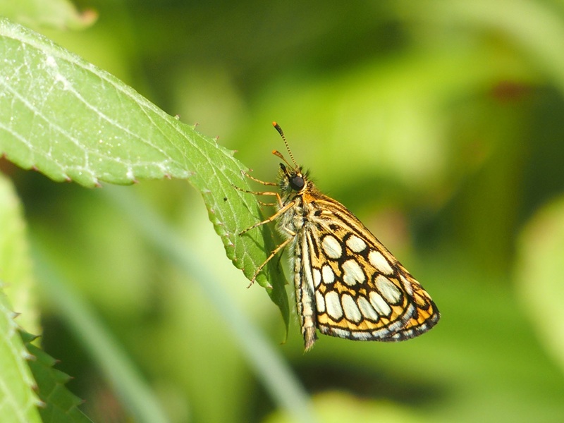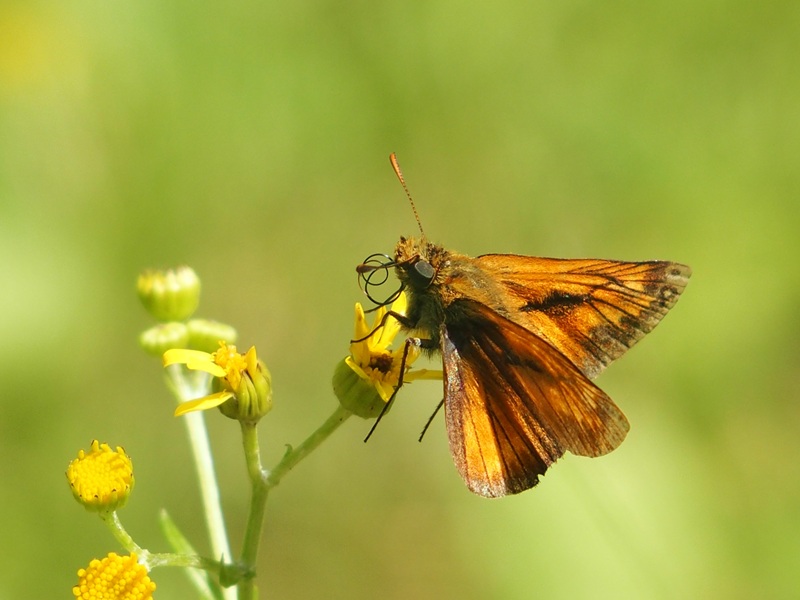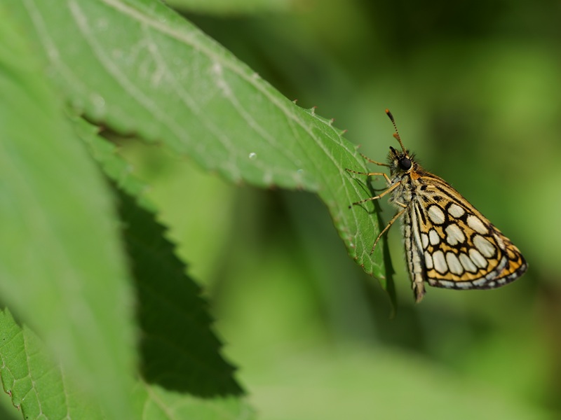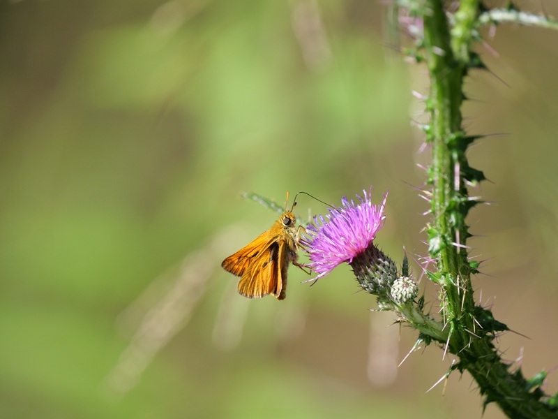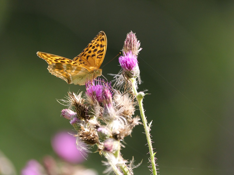 Doch zurück in die Gegenwart zu unserer Wanderung. Eben gingen wir durch den Wald. Orange Dickkopffalter konnten wir sehen und andere wunderbare Schmetterlinge, wie den Kaisermantel. Neben dem Weg im Straßengraben gab es Wasser. Die Frösche ließen sich eilig ins Nass plumpsen, sobald wir uns näherten. Und direkt am Straßenrand wuchsen Wegwarten, Johanniskraut, Disteln und Seifenkraut.