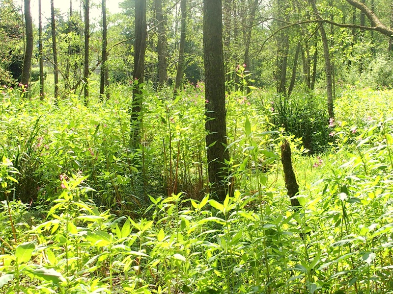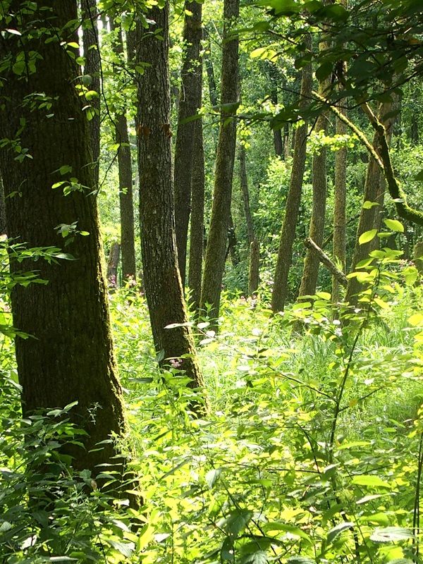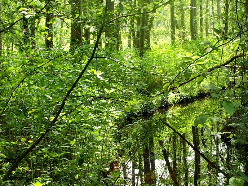 Ein kurzes Stückchen mussten wir auf Asphalt marschieren, dann konnten wir wieder in den nächsten Waldweg einbiegen. Entweder war der „gute Geruch“ des Insektensprays verflogen, oder es gab in diesem Waldabschnitt weniger Plagegeister. Jedenfalls hatte ich jetzt mehr Ruhe vor den Insekten. Der Waldweg führte bergab, und wir erreichten ein beeindruckendes Überschwemmungsgebiet. Scharen von Frösche flohen panisch über das Wasser, als sie uns bemerkten. Wir waren von diesem Fleckchen Natur so angetan, dass wir hier wahrscheinlich den vorgesehenen Wanderweg verloren. Über die Asphaltstraße kehrten wir in den Ort retour, ohne den Ziegelteich (das eigentliche Ziel unserer Wanderung) entdeckt zu haben. Egal – die Wanderrunde war trotzdem richtig toll und bot uns viele schöne Eindrücke.