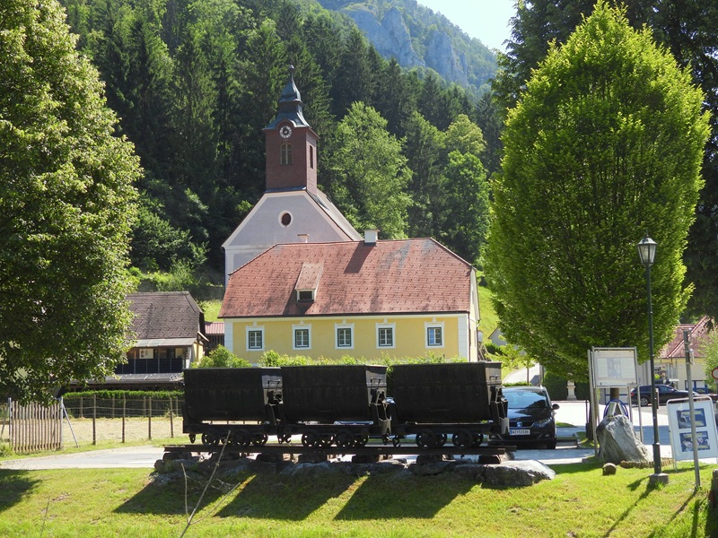 Vom Wanderparkplatz aus querten wir eine blumengeschmückte Brücke. Rechts marschierten wir entlang eines hübschen Bachs mit kristallklarem Wasser. Gut – streng genommen war es kein Bach, sondern die junge Raab. Tafeln zeigten an, wo sich früher Stollen befanden. Die nächste Station war das alte Knappenhaus. Hier findet man heute einen wahren Goldschatz: den Stollenkäse aus dem Almenland, der regelmäßig Medaillen beim World Championship Cheese Contest abräumt. Führungen und Verkostungen sind möglich.