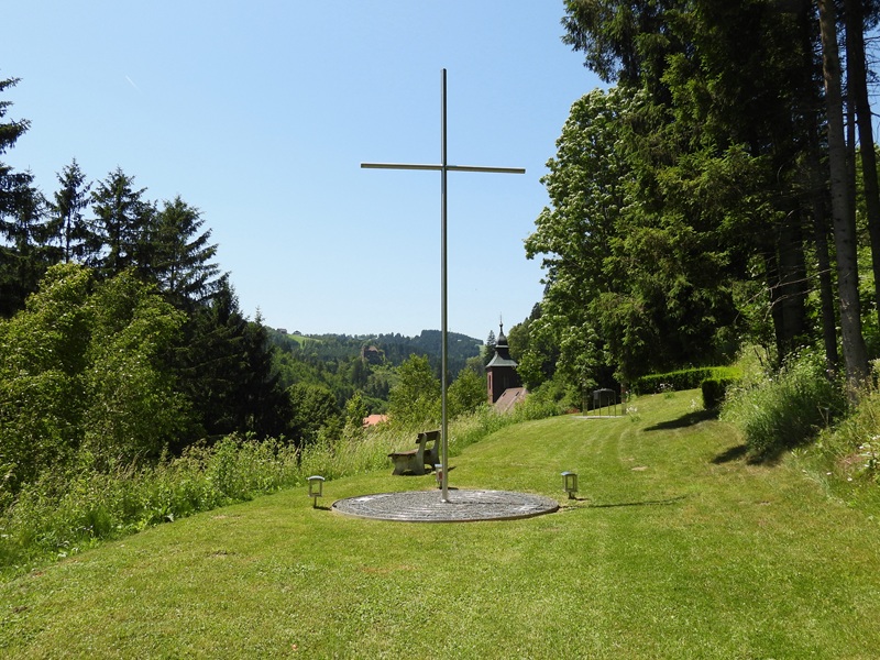 Die Kirche von Arzberg ist dem heiligen Jakob dem Älteren geweiht, dem Schutzpatron der Pilger. Wie es sich für ein Gotteshaus eines Bergwerksortes gehört, ist sie in Grau gehalten. Erbaut wurde sie 1789; eine ältere, baufällige Kirche war zuvor abgetragen worden. Noch jünger ist ein wunderbarer Platz oberhalb des Friedhofs: eine hübsche Wiese mit einem schlanken, modernen Kreuz und einem Altar aus Metall – ein guter Ort zum Innehalten.