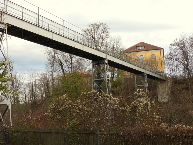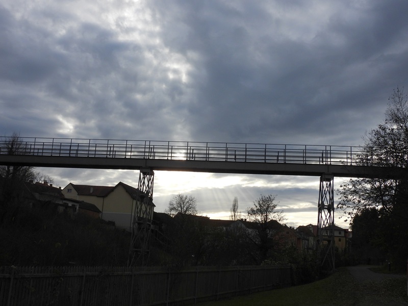 Über die Burgenlandstraße kamen wir zur Jugendherberge, marschierten ins Areal (links halten) und kamen auf eine Eisenbrücke. Die ATW-Brücke spannt sich sehr hoch über den Stadtgraben, ist 65 Meter lang und wurde in den 1880er-Jahren gebaut.