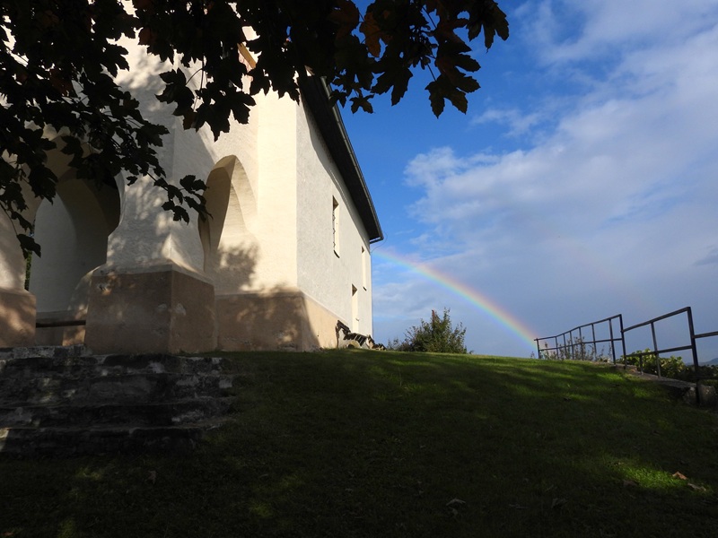 Unser nächstes Wanderziel war auch eine Kirche. Eine ganz besondere noch dazu. Die Wallfahrtskirche St. Georgen am Lukowitsch ist uralt – romanisch/gotisch – und man muss den Weg zwischen den blühenden Apfelbäumen schon suchen, um von der Straße zu ihr zu gelangen. Bei dieser Wanderung hatte ich die Kirche das zweite Mal gesehen, und wieder war ich begeistert. Steinerne Stufen führen zum Eingang, der Raum zwischen den zwei breiten Säulen und Kirchentür wirkte einladend. Eine einzigartige Kirche (um 1050 gebaut und somit eine der ältesten der Gegend) an einem mit Bedacht gewählten Ort.