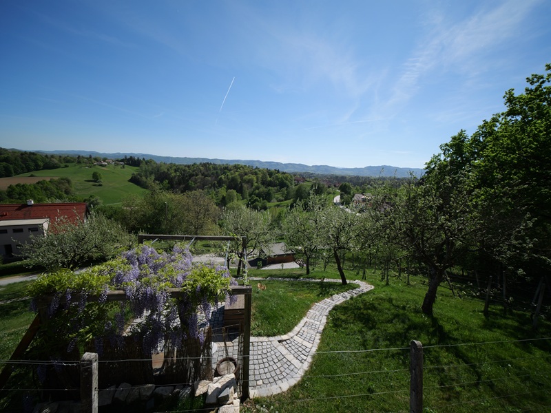Im Ort Haslach bogen wir rechts ab, die Asphaltstraße den Berg hinauf. Hier gab es einen Wald, was bei dieser Temperatur schon angenehm war. Bei der Kreuzung folgten wir dann dem Hinweisschild „Buschenschank Pölzl Bernhardtkeller“, was sich als sehr gute Wahl herausstellte. Ein sehr gepflegter Gastbetrieb mit einer guten Jause und absolut rekordverdächtiger Aussichtsterrasse. Den großen Speikkogel mit der Goldhaube gab es da zu sehen, die Josefikirche von Schwanberg sowie die Burg Deutschlandsberg. Unter dem Buschenschank war eine Weide mit schwarzen Schafen, hinter dem Buschenschank gab es Kellerstöckel und blühende Apfelbäume. Wunderbar. Gregi war mehr als zufrieden: Erstens hatte er vorhin einen Schwalbenschwanz fotografiert und eine gute Mehlspeise hatte er auch noch bekommen.