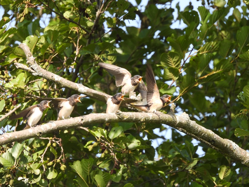Vor der Pinka bogen wir rechts ab und folgten dem Fluss. Die Uferböschungen sehen naturbelassen aus – hier ist die Kinderstube von unzähligen Vögelchen. Emsig flatterten Schwalben in der Luft. Ein helles Zwitschern war zu hören. Gregi entdeckte sie zuerst. Fünf Schwalbenküken saßen auf einem Ast und wollten gefüttert werden. Keine leichte Aufgabe für die fürsorglichen Eltern.