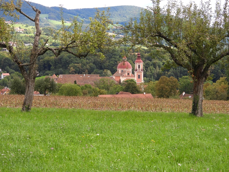 Nun geht der Pfad steil zum Bach runter, über ein Brückerl, dann kommt noch eine schweißtreibende Steigung. Im Obstgarten grast ein Esel und dann kommt die – meines Erachtens – schönste Aussicht der Wanderung. Der Ort Pöllau mit Stift und dahinter die Pöllaubergkirche. Wunderbar!