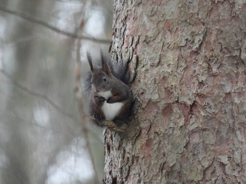 Wir haben diese Wanderung schon drei Mal gemacht und jedes Mal hatten wir hier wunderbare Erlebnisse. Wir durften Rebhühner beobachten, wie sie Futter suchten, ich hatte einmal eine Tannenmeise vor der Kameralinse (leider unscharf) und Linda fotografierte ein keckes Eichhörnchen, das uns ganz interessiert beobachtete (aufgeregt naschte es dabei eine Nuss).