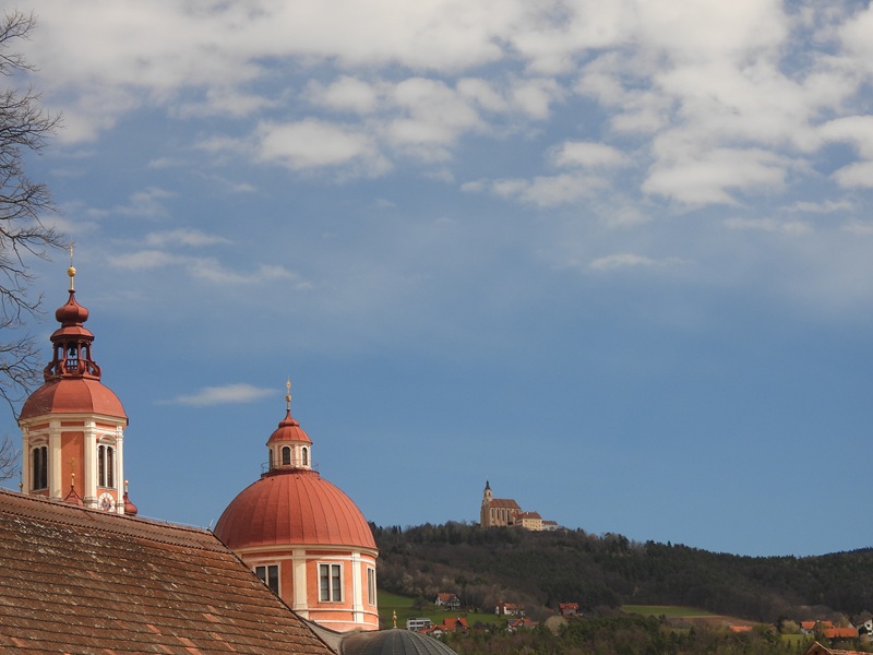 Leider bin ich jetzt etwas abgeschweift. Also wieder zurück zu unserer Wanderung: Wir verlassen den Ort in Richtung Masenberg, überqueren den Kreisverkehr und streben dem Wald entgegen. Ein lieblicher Pfad leitet uns über den Hang eines Bergwaldes. Gregi und ich überlegen uns, ob wir eine Rast bei einem exponierten Bankerl, hoch über der Straße, einlegen sollen. Die Blätter rund um uns sind sehr üppig, doch erhaschen wir einen schönen Blick auf den Ort und das Stift.