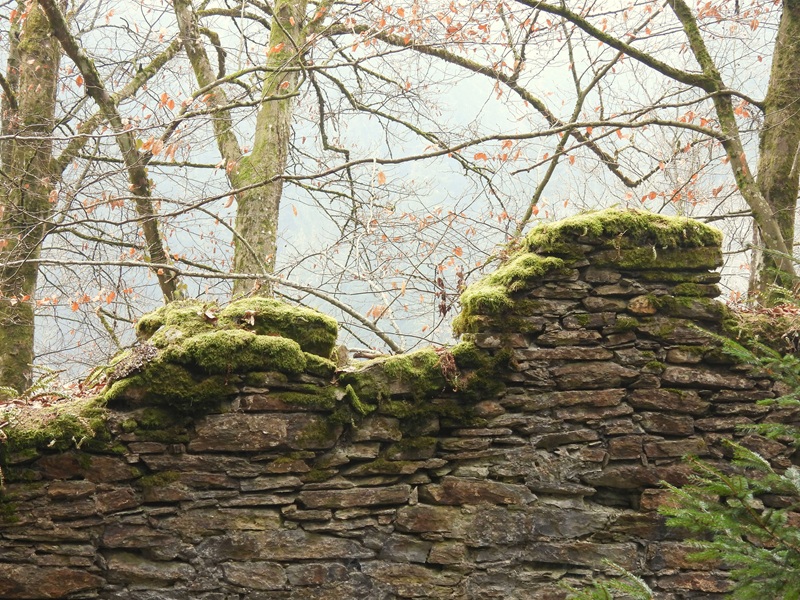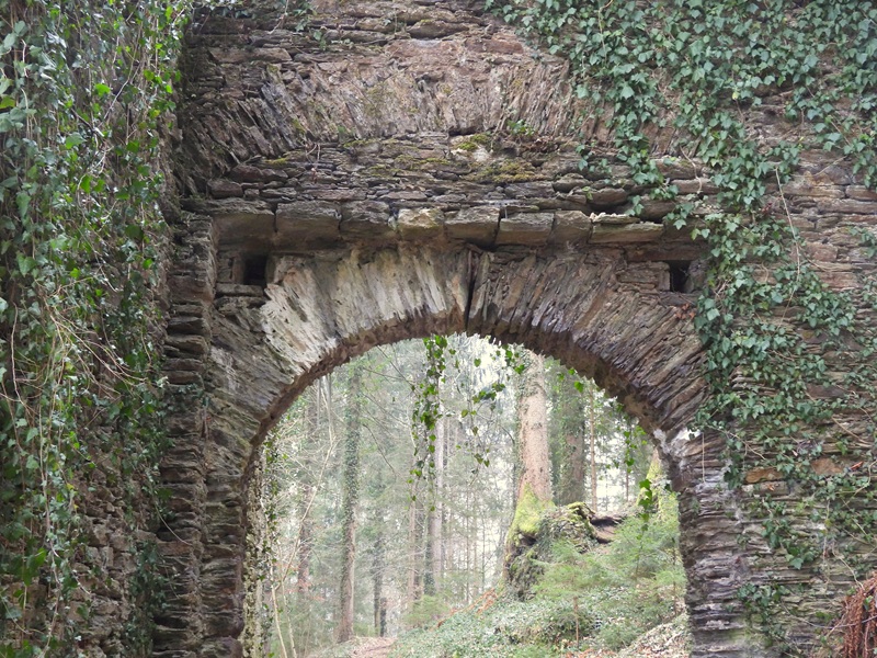 Zurück zu unserer Wanderung. Wir konnten die Burg sicher durchschreiten, dann kamen wir in einen wunderlichen Gang oder Graben. „Das muss die Stelle gewesen sein, wo das Baumaterial abgebaut wurde“, schloss ich. Über diesen Ganggraben betraten wir eine hübsche Wiese und dann ging es bergauf, immer den gelben Wegweisern „Alt-Leonroth“ nach. Wir näherten uns der Kuppe des Berges, Gregi merkte an, dass diese Kuppe eindeutig von Menschen bearbeitet und terrassiert worden war – wir wähnten uns unserem Ziel „Alt-Leonroth“ nahe. Dann die bittere Erkenntnis: nix da. Wir mussten links abbiegen, hinein in einen Wald – es ging bergab, wir hörten einen Bach rauschen. „Laut Wegweiser müssen wir über den Bach springen“, stellte ich entgeistert fest. „Und das ist kein kleines Rinnsal, sondern ein breiter Bach, wo wir über vereiste, glatte Steine steigen müssen.“ „Er ist aber nicht tief“, meinte Gregi gelassen und war mit seinen langen Beinen bereits auf der anderen Seite. Ich komme leider eher nach den Hobbits – also kurze Haxen und nicht unbedingt gämsengleich. An einem eisigen Jännertag einen Wildbach zu queren ist da schon eher purer Leichtsinn. Als ich endlich meine Todesangst überwunden und ebenfalls das andere Ufer erreicht hatte, wusste ich genau: Egal, wie lange die Wanderung noch dauern würde, zurückgehen war ausgeschlossen. Berg rauf … wieder bergab … wieder bergauf. „Siehst du schon eine Ruine?“, wollte Gregi wissen. „Ne“, antwortete ich. „Da gibt es einen Wegweiser – Teigitschklamm.“ „Rauf geht es zur Ruine“, meinte Gregi und wir stiegen bergan. „Wo rohe Kräfte sinnlos walten“, zitierte ich, als ich die Riesenbaustelle sah. Eine Forststraße wurde rund um die Ruine Alt-Leonroth errichtet. Ein riesiger Stapel Holzblöcke lag im Halsgraben – ein Zugang zur Kuppe, auf dem sich die spärlichen Mauerreste befanden, war nur sehr erschwert möglich. Dieser Platz lud eindeutig nicht zum Verweilen und Schauen ein. Also kehrten wir um und folgten dem Wanderweg, der uns zum unteren Ende der Teigitschklamm führte.