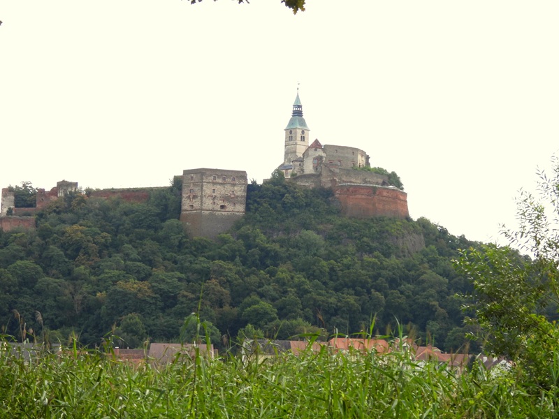 Wir zweigten links in den Feldweg ein und hatten einen schönen Blick auf den Vulkanhügel samt Burg. Selbst an sonnigen und hellen Tagen wirkt die Wehranlage dunkel und düster. Die Burg war Teil des Verteidigungsrings im Westen von Ungarn. Wir Steirer hatten unseren Burgengürtel zur Verteidigung gegen mögliche Feinde aus dem Osten – die Ungarn hatten einen Verteidigungsring gegen mögliche Angriffe aus dem Westen. Und die Güssinger Burg war sehr wehrhaft – so leicht konnte sie nicht eingenommen werden. Das musste König Ottokar von Böhmen erfahren – auch die „Goldene Horde“ der Tataren musste sieglos wieder abziehen.