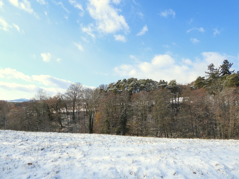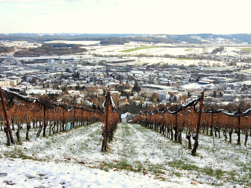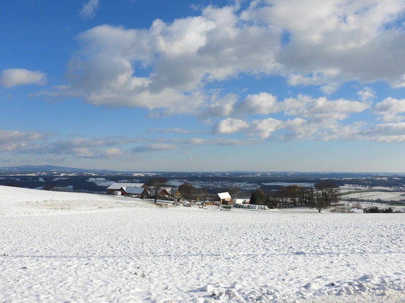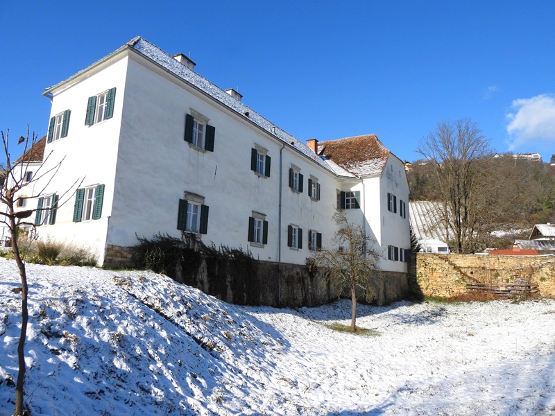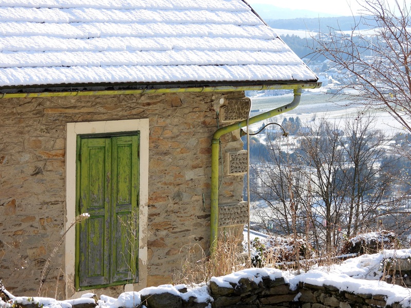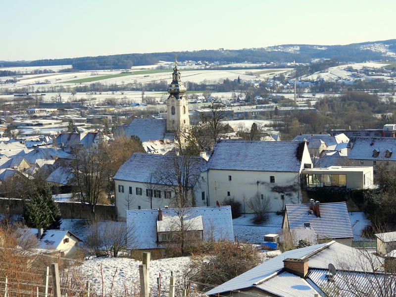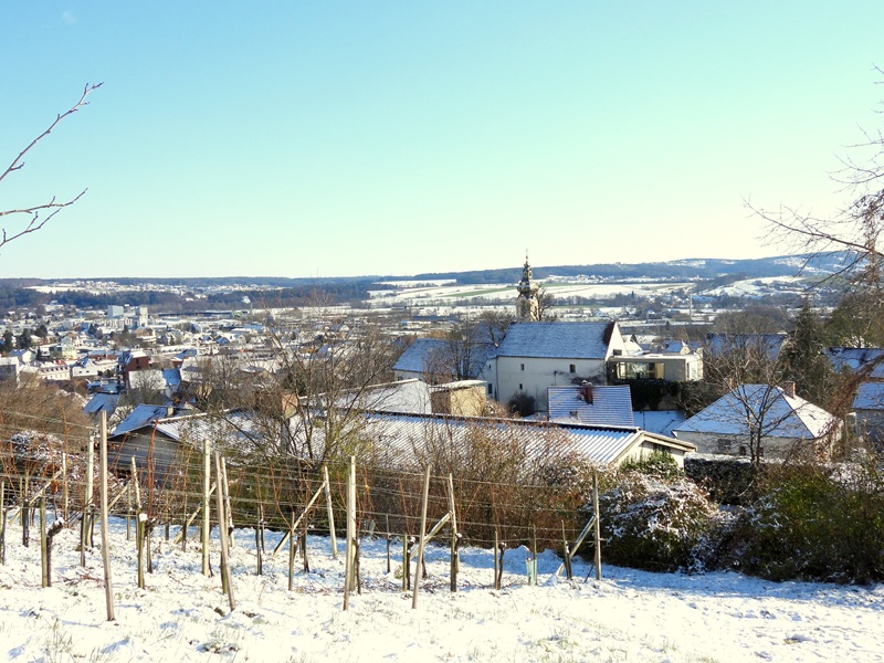 Es ist wunderbar, dass die ehemalige Burg (das jetzige Schloss Hartberg) heutzutage friedlichen Zwecken dient – in der Adventzeit beherbergt sie ebenfalls einen herrlichen Adventmarkt. Wir verließen das Schlossareal durch einen Durchlass in der Stadtmauer, rechts den Steg hinauf, das alte Mauerwerk entlang. Links bemerkten wir dann den Wegweiser „Laternderlweg“. Steil ging es in Kehren bergauf, mit einem prächtigen Blick auf die Altstadt. Die goldige Verzierung der Stadtpfarrkirche (hl. Martin – urkundlich erstmals 1157 genannt) leuchtete in der Sonne. Gregi wischte Schnee von einem Bankerl und meinte: „Jetzt kann es trocknen und vielleicht möchte sich jemand draufsetzen und den herrlichen Blick genießen!“ „Ja, die alten Bauherren haben gewusst, wie man schön baut. Es müssen in den letzten hundert Jahren sehr viele Leute gewesen sein, die sich an diesem Ausblick erfreut haben.“