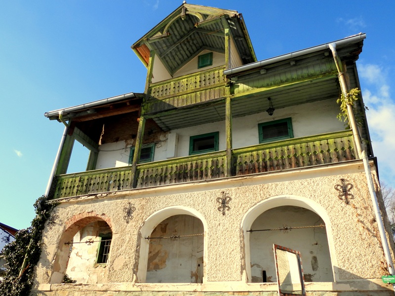 Wir erreichten einen schmalen asphaltierten Weg, stiegen eine steile Treppe hoch und querten die Straße. Vor uns ein tolles verlassenes Haus. Ein Eins-a-Fotomotiv. Dann ging es weiter bergauf, neben uns gab es angelegte Terrassen, vor uns ein tolles Aussichtsbankerl.
