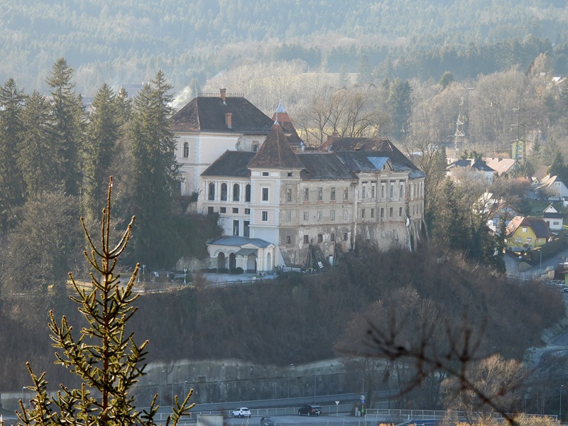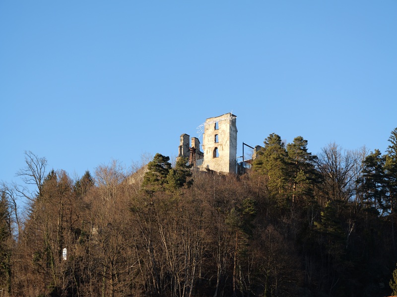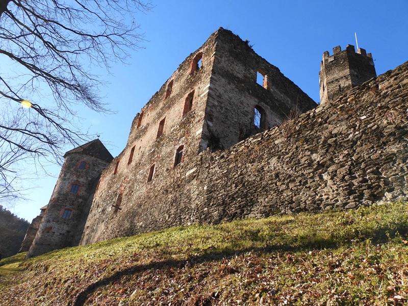 Ein hübscher Weg führt um die große und sehenswerte Ruine herum. Hier im Osten von Voitsberg, wo das Kainachtal sehr, sehr eng ist, bot sich dieser schmale Bergrücken richtiggehend an, darauf eine Wehrburg zu bauen. Der älteste Teil ist der Bergfried mit seinen fünf Stockwerken, der im 12. Jahrhundert gebaut wurde. Er steht auf einem sehr markanten Felsen, und wenn man außen unter diesem Felsen hindurchgeht, hat man schon ein bisschen ein mulmiges Gefühl und hofft inständig, dass Turm und Felsen nicht gerade in diesem Moment abrutschen. Angeblich soll dieser Turm auf römischen Grundmauern aufgebaut worden sein. Also keine Angst, dieser Teil der Wehranlage scheint stabil zu sein. Was man leider von einigen Gemäuern im Südosten der Burg nicht behaupten kann. 1817 rutschte ein Teil des Schlosses ab. Burg – Schloss … was war die Ruine früher wirklich? Die ältesten Teile der Burg stammen aus dem 12. Jahrhundert, im 14. Jahrhundert wurde die Burg erweitert und im 16. Jahrhundert kam es zu einem großen Umbau. Ein prächtiges Schloss wurde unter der Herrschaft der Herbersteiner gebaut. Das Gebäude hatte viele Besitzer: Krems-Leonrode, Walseer, Montforter, Herberstein, Saurau … 1857 erwarb sie Erzherzog Johann. Heute gehört sie dem Verein „Licht im Leben“.