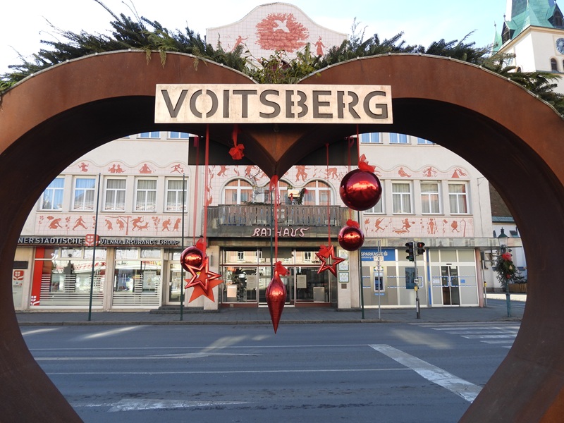 Danach fuhren wir direkt ins Stadtzentrum. Vom Hauptplatz aus starteten wir unseren zweiten Spaziergang. Hübsch weihnachtlich geschmückt präsentierte sich Voitsberg. Der Weihnachtsbaum vor der Kirche war riesig, die Bäume im Zentrum trugen hübsche Kugeln, Tannenreisig schmückte die Straßenlaternen. Die Fassade des Rathauses sollte man sich näher ansehen. Der Künstler Prof. Arik Brauer hat sie gestaltet. Seit 2003 gibt es auch ein Glockenspiel. Und wir hatten das Vergnügen, eben dieses Glockenspiel zu hören. Am langgestreckten Hauptplatz gibt es noch einen Barbarabrunnen und eine Mariensäule erinnert an die Pest, die von 1713 bis 1716 in dieser Gegend wütete.